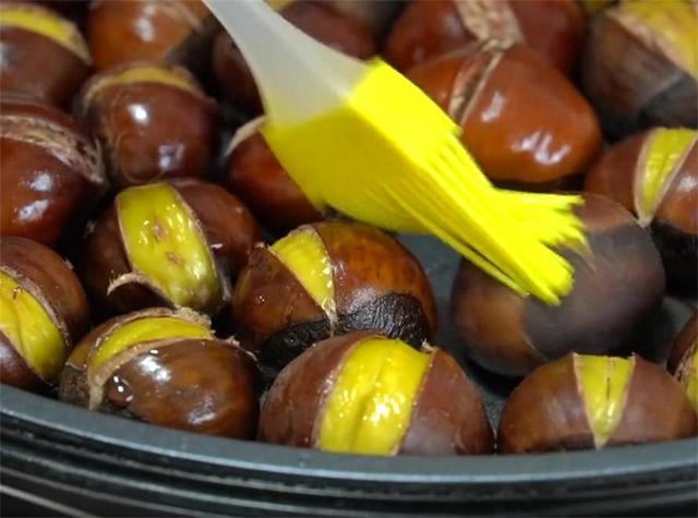 6.現(xiàn)在時(shí)間到了,看一下,基本上每個(gè)都已經(jīng)開了花,聞著就特別香,用刷子把剛才調(diào)好的蜂蜜均勻的刷在板栗的開口處,每一個(gè)都要刷上,再蓋上蓋子繼續(xù)燜兩分鐘。