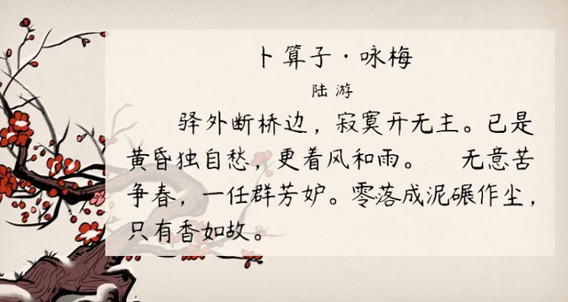 卜算子· 詠梅 作者:陸游 驛外斷橋邊,寂寞開無主。已是黃昏獨自愁,更著風和雨。 無意苦爭春,一任群芳妒。零落成泥碾作塵,只有香如故。 譯文:寂寞無主的幽梅,在驛館外斷橋邊開放。已是日落黃昏,她正獨自憂愁感傷,一陣陣凄風苦雨,又不停地敲打在她身上。 她完全不想占領春芳,聽任百花群艷心懷妒忌將她中傷。縱然她片片凋落在地,粉身碎骨碾作塵泥,清芬卻永留世上。 《卜算子·詠梅》賞析 這是一首詠梅詞,上片集中寫了梅花的困難處境,下片寫梅花的靈魂及生死觀。詞人以物喻人,托物言志,以清新的情調寫出了傲然不屈的梅花,暗喻了自己雖終生坎坷卻堅貞不屈,達到了物我融一的境界,筆致細膩,意味深雋,是詠梅詞中的絕唱。