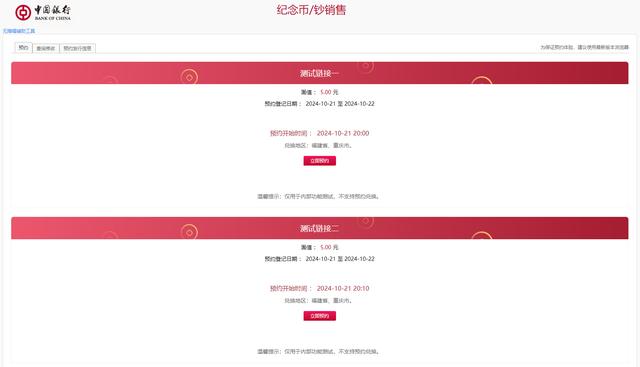 按照慣例,在紀念幣發行之前,部分銀行會提前進行測試預約,以保證正式預約的順暢開展。 而試約的開啟,也意味著新的京劇幣馬上就要和我們見面了。 在測試預約中,我們已經能完整走完預約流程,每個人都可以預約20枚。 需要注意的是,京劇旦角幣的具體預約時間,暫時還沒有公布,需要等到發行公告,有新的消息,百科網也會及時通知。 3次預約機會火熱的京劇旦角幣,有不少藏友擔心,會約不到。 好消息是,從試約頁面來看,這次新幣預約或許有新變化,每人最多會有3次預約機會。 第一次預約機會,是首日的線上預約。 每人都可以在各行入口預約20枚。 第二次預約機會,是次日的線下預約。