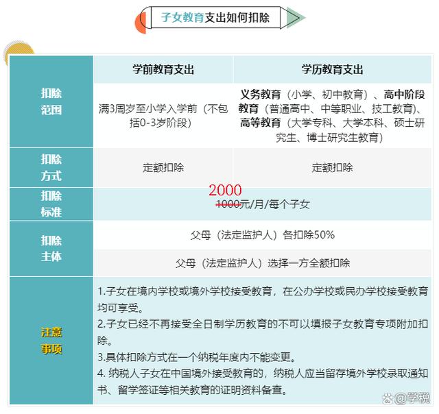 2、子女教育,1000→2000! 一般情況下,家里有3歲以上上學(xué)的孩子,無(wú)論是上幼兒園(包括不上幼兒園的),還是上小學(xué)、初中、大學(xué)等,都可以享受子女教育專項(xiàng)附加扣除。根據(jù)最新規(guī)定,子女教育專項(xiàng)附加扣除標(biāo)準(zhǔn)由原來(lái)的每個(gè)子女1000元提高到了2000元。子女教育最新扣除標(biāo)準(zhǔn)如下圖所示: