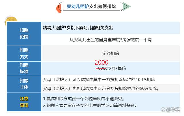 先給大家劃一下最新政策的重點(diǎn)內(nèi)容,供大家參考: 自2023年1月1日起,3歲以下嬰幼兒照護(hù)費(fèi)用等3項(xiàng)專項(xiàng)附加扣除標(biāo)準(zhǔn)提高,具體情況如下: 1、3歲以下嬰幼兒照護(hù),1000→2000! 一般情況下,家里有3歲以下寶寶的,可以享受3歲以下嬰幼兒照護(hù)專項(xiàng)附加扣除。根據(jù)最新規(guī)定,每個(gè)嬰幼兒的扣除標(biāo)準(zhǔn),從原來(lái)的1000元提高到了2000元。3歲以下嬰幼兒照護(hù)最新扣除標(biāo)準(zhǔn)如下圖所示: