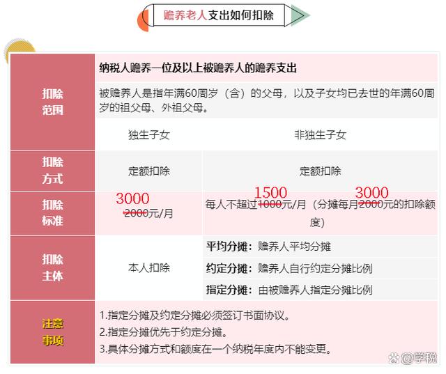 3、贍養(yǎng)老人,2000→3000! 家里有年滿60周歲的老人,符合相關(guān)條件的,可以享受贍養(yǎng)老人專項(xiàng)附加扣除。根據(jù)最新規(guī)定,贍養(yǎng)老人專項(xiàng)附加扣除標(biāo)準(zhǔn)由原來(lái)的2000元提高到了3000元。 其中,獨(dú)生子女每月可全額享受3000元的標(biāo)準(zhǔn),非獨(dú)生子女則需要跟兄弟姐妹進(jìn)行分?jǐn)偅颐總€(gè)子女最高不超1500元/月。 贍養(yǎng)老人最新扣除標(biāo)準(zhǔn)如下圖所示:
