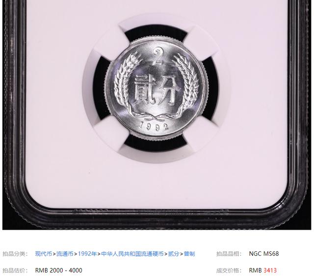 上面這枚品相完好的1980年2分硬幣,就在現(xiàn)代錢幣春拍中,拍出了4291的高價。 其次是1992年的2分硬幣。 這種2分是硬分幣四小龍之一,熱度僅次于天王幣。