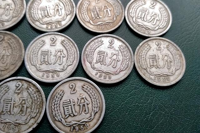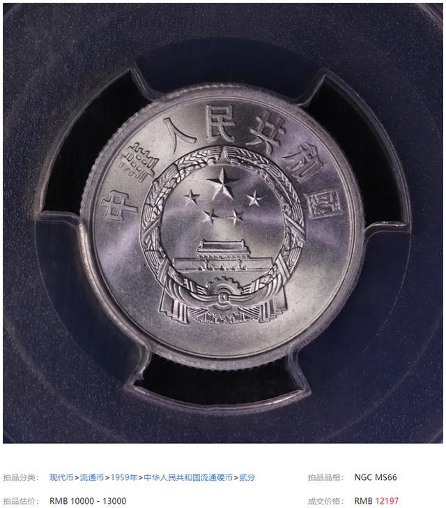 上面這枚92年的2分,同樣在現(xiàn)代錢幣春拍中,拍出了3413元。 不過以上兩種發(fā)行數(shù)量較為稀少,很多人可能并不能找到。接下來要說的,就是曾經(jīng)廣泛進入流通,人人家里都有可能找到的2分硬幣了。 在所有流通年份中,最為少見的,是1959年的2分硬幣。 這種流通2分,如果品相還是全新的,表現(xiàn)甚至是頂尖水平的。
