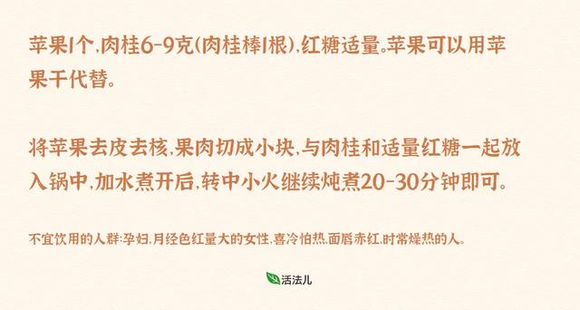 肉桂:這個小神木,補陽氣不上火,很適合冬天人應該頭腦清涼,命門之火(下焦)溫暖,有時候我們常常是反的。我們的火(陽氣)總是亂飄,可能讓我們嗓子痛,長痘痘,心神不寧,睡不好覺,這是陽氣跑錯了地方,肉桂可以「引火歸元」,就是把虛浮的火氣拽下來,把溫熱之氣,留在下焦,通經脈,溫腎氣。 注意分清肉桂和桂皮,桂皮顏色更深,味道也沒有那么香,肉桂發紅一些? 容易不開心的人,情緒小郁悶的人可以試試這個肉桂蘋果水。?