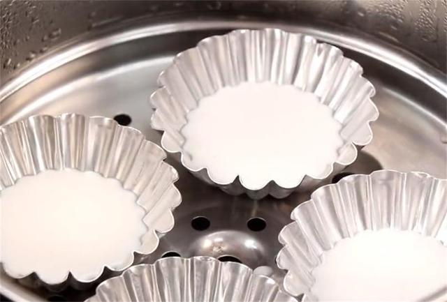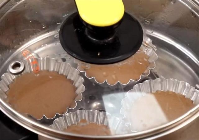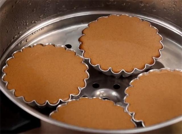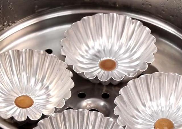 3.準備四個模具,擠入紅糖面糊在花心中,蓋上蓋子蒸3分鐘左右。