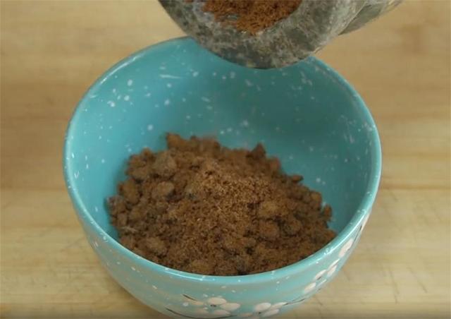 4.準備三塊老紅糖,放在一個祖傳的蒜臼里,把它們搗碎,家里如果沒有老紅糖,可以用普通紅糖代替,先放到碗里備用。