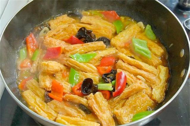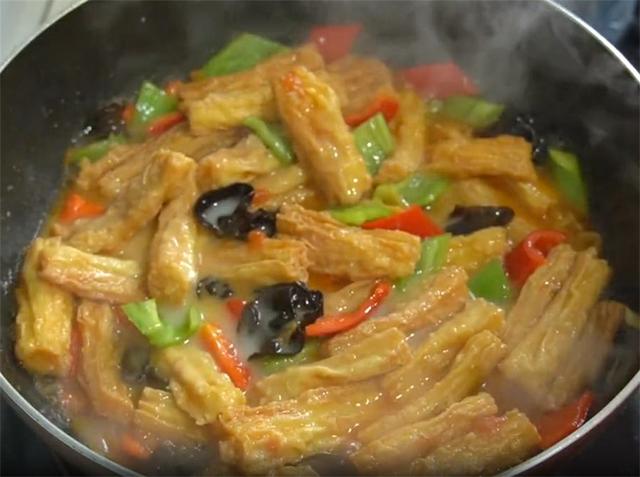 7.鍋里少放點油,下入蔥姜蒜炒出香味,下入切好的西紅柿塊,加入一小勺鹽,先把西紅柿的汁水炒出來,下入處理好的木耳,再加入一碗清水,放點生抽、適量的胡椒粉,一勺白糖提鮮,再下入炸好的腐竹,中火燉兩分鐘,讓腐竹先吸足湯汁,時間到了以后,下入青紅椒繼續翻炒均勻,淋入適量的水淀粉勾芡,等湯汁變得比較粘稠就可以出鍋了。