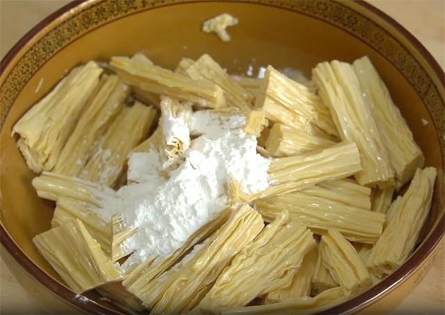 5.碗里加入一大勺玉米淀粉把腐竹攪拌均勻。(www.wS46.com)