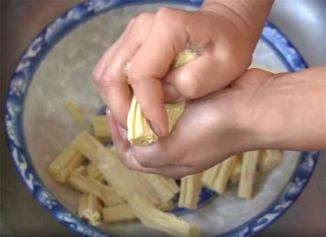 1.大家好,今天用腐竹做道簡單好吃的家常菜。聽一位年長的阿姨說,腐竹要選擇顏色有光澤,淡黃色的,還有很小的空心,聞起來有淡淡的清香。先把它們用涼水浸泡4個小時以上,也可以提前一晚上泡好,但是不要用熱水,泡好的腐竹再清洗干凈,把水分擠干備用。