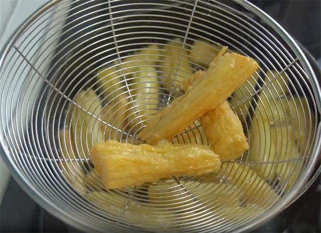 6.油溫升到7成熱,改小火把腐竹下鍋,全程用小火來炸,中間用筷子翻動一下,保證受熱均勻,一直炸到表面微黃,有氣泡狀的凸起就行了,大約需要四分鐘左右,撈出來控油備用。