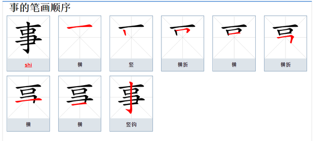 事的簡介 “事”,普通話讀音為shì,在六書中屬于形聲字。“事”的意思是:1.事情:國事。公事。2.事故:出事。平安無事。3.職業(yè):謀事。4.關(guān)系;責任:回去吧,沒有你的事了。5.從事:大事宣傳。6.侍奉;伺候:事親。 事的筆順 事的筆順讀寫為:橫、豎、橫折、橫、橫折、橫、橫、豎,共8畫。
