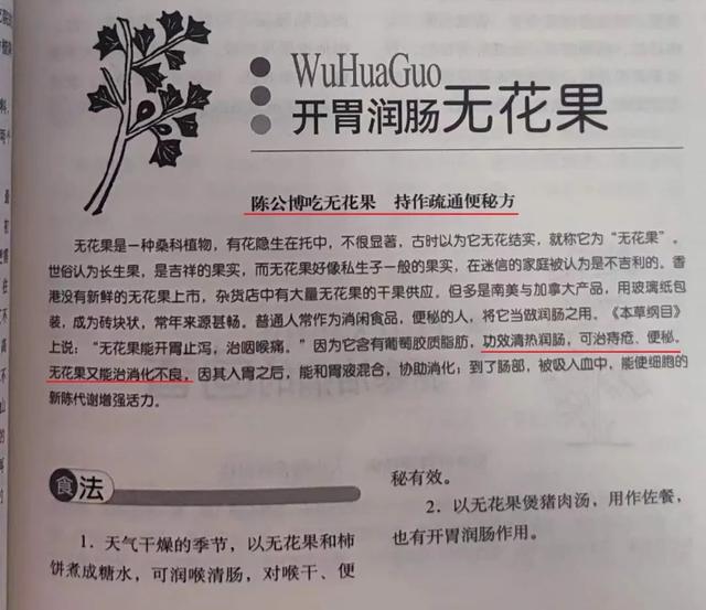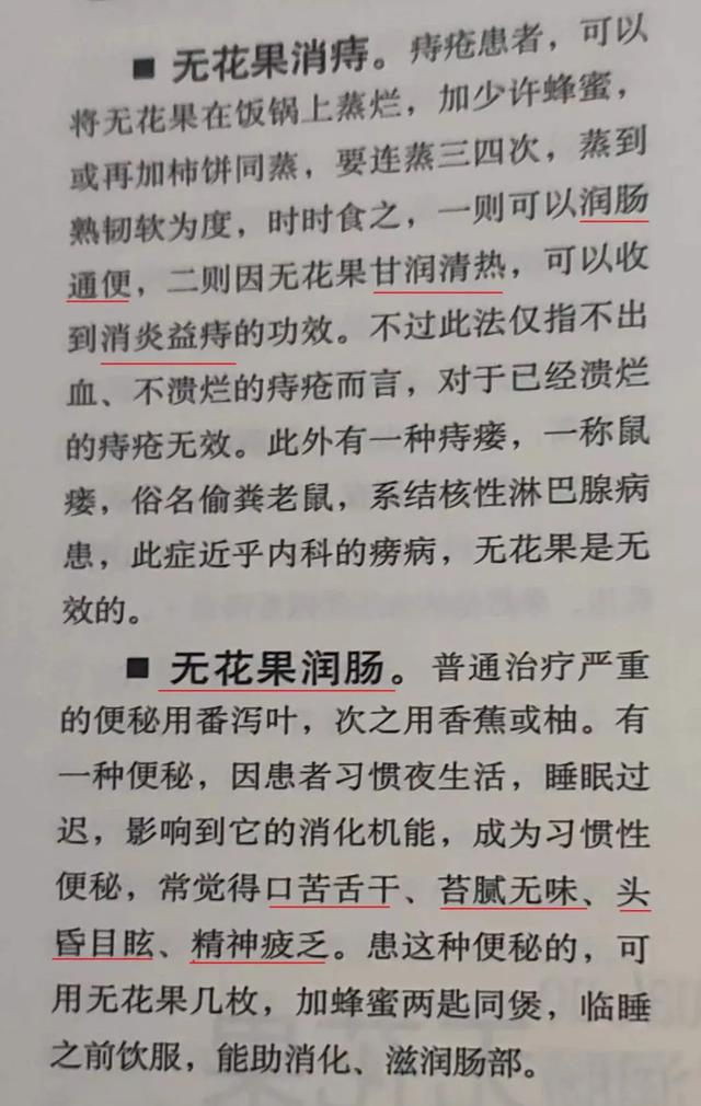 你看,無(wú)花果潤(rùn)肺、清腸,特別適合當(dāng)下這個(gè)干燥的秋冬,而且它性味平和,沒(méi)有任 何禁忌,就連孩子、孕婦、哺乳期、老人都能吃。 如果你大便不通、臉上爆痘、有“痔”青年、有抽煙、喝酒、熬夜習(xí)慣、冬天口鼻干、嗓子干癢疼痛,都可以經(jīng)常吃,把脾胃、大腸、肺的垃圾清一清,身體舒坦暢通,皮膚也好! 連國(guó)醫(yī)大師陳存仁在他的《津津有味譚》里也非 常 推 薦,書(shū)里詳細(xì)的寫(xiě)了無(wú)花果的功效和適用人群,我拍照給大家看看!