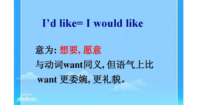I would like的用法 后面接名詞或代詞,表示“具體要”某樣東西。例如: I'd like two sweaters for my daughters. 我想給我的女兒們買兩件毛衣。 后面接動詞不定式,表示“愿望,喜愛”,常用于有禮貌地提出邀請、請求或建議。例如: I would like to drop maths. 我想放棄數學。 當主語是第一人稱時,would 可與should 換用,它們都可以縮寫為'd ,并且like 也可換成love。例如:I'm sure he would love to come. 我確信他愿意來。 “ would like ”后面可以用動詞不定式作賓語補足語。例如: I'd like you to meet my parents,too. 我想要你也見見我的父母。
