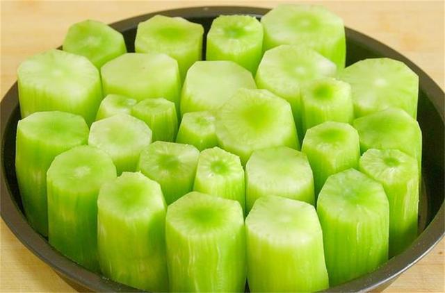 1.大家好,今天用兩根萵筍做個好吃的,這兩根萵筍一共是六斤,先把葉子摘下來,可以拿來蘸醬或者炒菜都不錯,再切成5厘米左右的段,然后用刀把皮削掉,個人感覺這樣比整根去皮更省事一些。