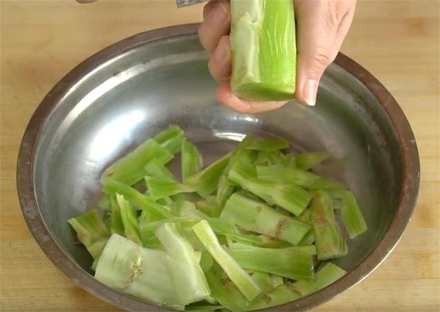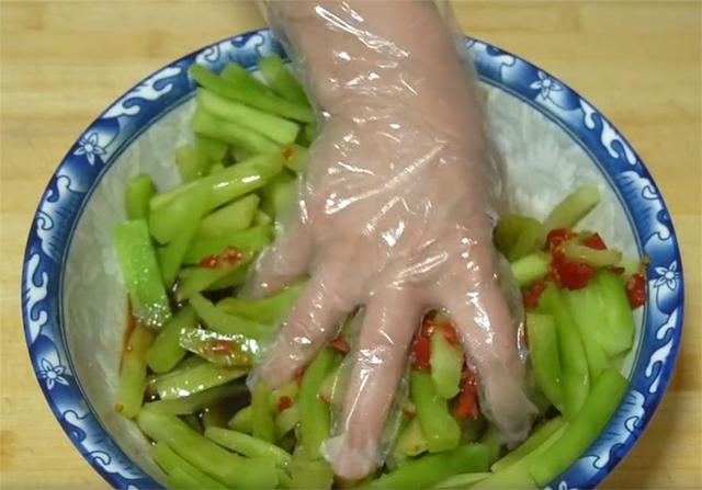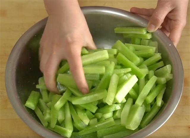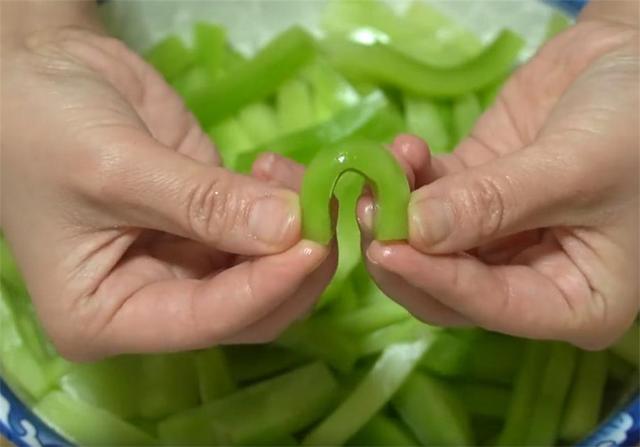 3.這就是已經殺水后的效果,出來很多水分,再用流水沖洗干凈,把水分擠干,這樣腌制以后的萵筍比較軟,輕輕就能折過來,而且不會斷。