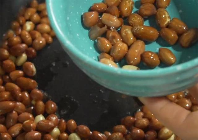 4.涼鍋涼油,倒入適量的花生米,用小火不停的翻炒,炒到花生米顏色變深,噼里啪啦的聲音消失以后就行了,先盛到碗里備用。