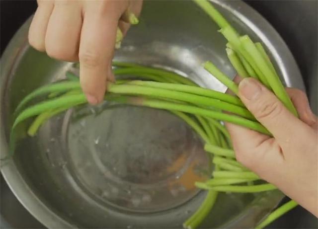 1.大家好,今天用蒜苔做道簡單又開胃的小菜,不用切也不需要炒。洗凈的蒜苔先把尾部摘下來,可以留著單獨炒個菜,處理好以后先放一邊備用。