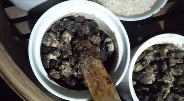 在蒸制的時候需要專人看管火候,火太大或是太小都不可以,剛開始蒸的玉靈膏,顆粒明顯是干燥的。桂圓顏色也是較正常的金黃色。等到6個小時以后,桂圓肉就會變黑,每蒸上一段時間,都會上下攪拌,讓氣受熱均勻。