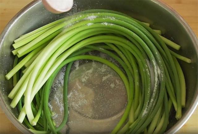 2.準(zhǔn)備一個無水無油的大盆子,先把一部分蒜苔放進(jìn)去,加入30克鹽,用雙手反復(fù)揉搓一會兒,這樣可以讓鹽快速滲進(jìn)去,去掉蒜苔的辛辣味,再把另一部分蒜苔放進(jìn)去,繼續(xù)重復(fù)剛才的步驟,全部處理好以后,放一邊腌制3個小時以上。