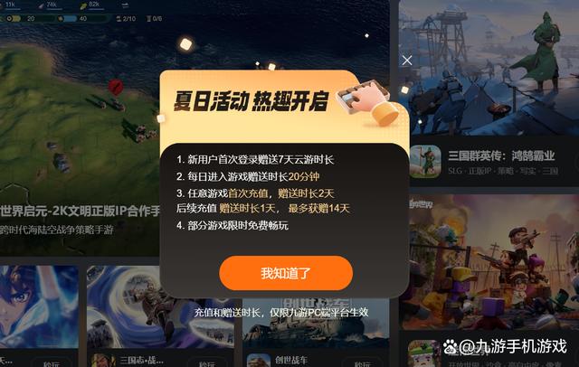 由于很多款游戲需要占據(jù)大家很多的內(nèi)存,導致很多小伙伴們就不會考慮這個游戲。在九游云游戲這,大家就可以玩許多款游戲,這樣是不是更加劃算呢。每個游戲都有相應的攻略,如果大家沒玩過某款游戲的話,又想嘗試一下,那怎么辦呢?大家無需擔心,剛進入游戲會有新手教程,大家只要熟悉記住操作步驟就可以輕松掌握某款游戲,其他游戲大家自行可以探索探索。 還可以查看游戲更新信息,以便大家及時知道游戲的改變。大家不妨在九游云云游戲官網(wǎng)上試一試。
