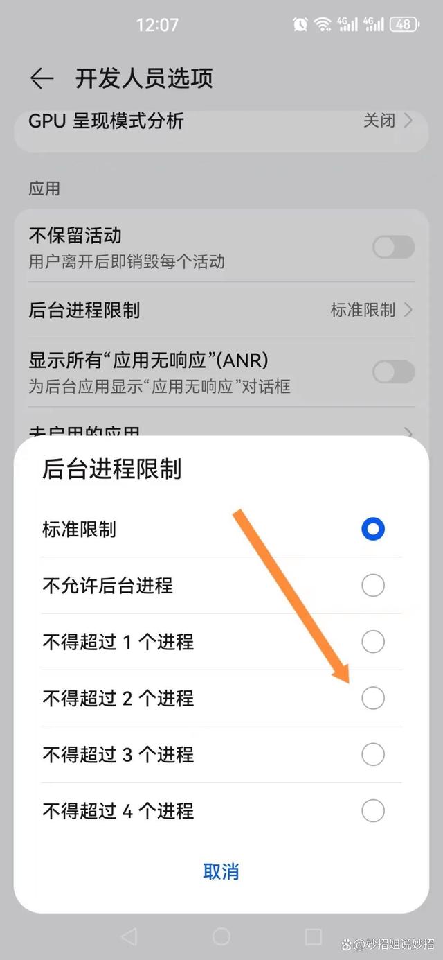對于安卓手機用戶,還可以進入開發者選項,設置后臺進程限制,數量可以限制在1到4個,也可以直接不允許后臺進程運行。