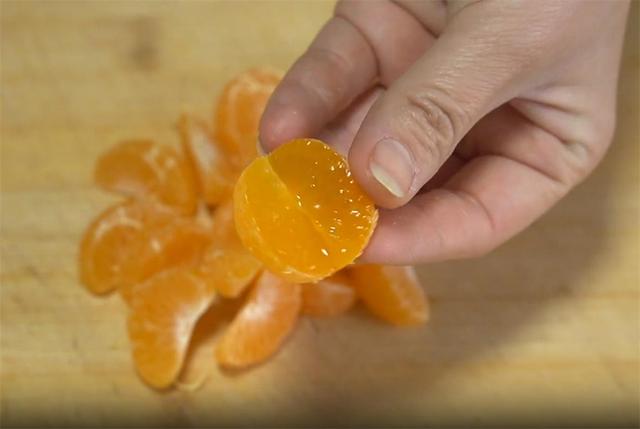 2.準備幾個小橘子,也把皮去掉,還有里面的毛毛也去掉,在背部劃一刀,像這樣就可以,也均勻的擺在盤子里。