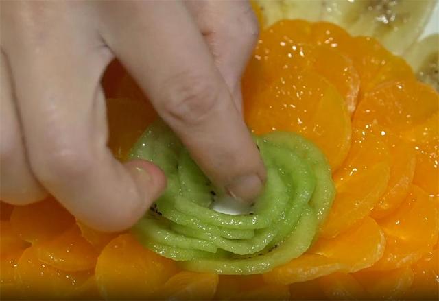 3.準備一個獼猴桃,對半切開,再切成薄片,獼猴桃當做花心。