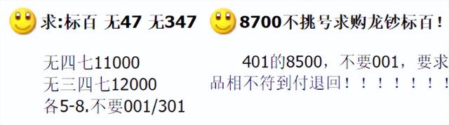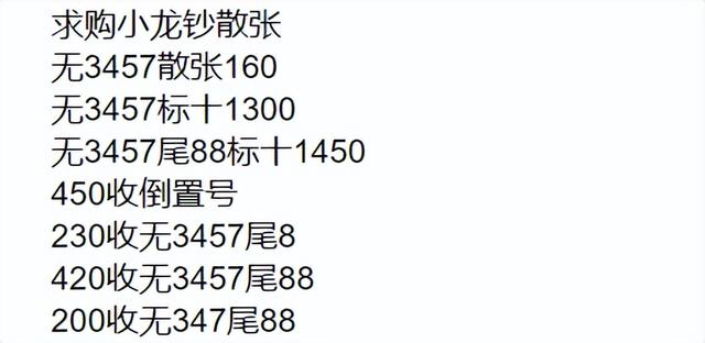 它們的要求也不復雜,倒置號是只有01689組成,圓圓號是只有0689組成。 我們更加熟悉的豹子號,基本也要200多起步了。 在龍鈔中看,各種基礎的靚號,都擁有極為出色的表現,大家也可以多多留意。其他還有諸如年份號、愛情號、順子號等等,也不要小看了。 期待2次預約以上提到的,全部是回收的報價,實際上的成交表現還要再高不少。大家也不用擔心 沒啥人要。(www.ws46.com) 此外,由于靚號種類眾多,在兌換龍鈔后,很多朋友都能找到。