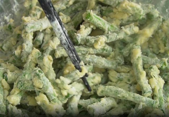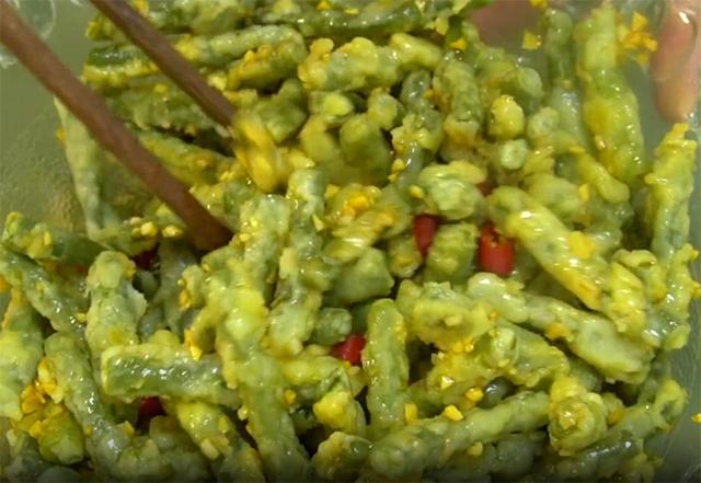 3.再加一勺鹽攪拌均勻,然后分次加入適量的面粉和清水,每加一點(diǎn)就充分?jǐn)嚢枰幌?,讓每根豆角都裹上面粉,面粉也不用太多,像這樣薄薄的一層就行了。