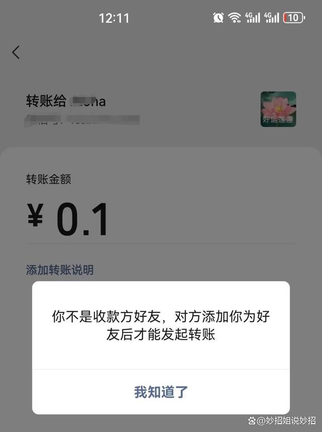 二、轉賬法 轉賬的方法適合好友不是很多的人來使用。你想查看誰有沒有把你刪除,可以打開和他的微信聊天對話框,然后給他轉賬0.1元。如果看到 “你不是收款方好友,對方添加你為好友后才能發起轉賬” 這樣的提示,那很明顯你已經被對方刪除了。如果對方沒有刪除你,就會出現輸入密碼的界面。判斷對方有沒有刪除你之后,直接取消轉賬就可以了。不過,這種方法需要一個好友一個好友地去轉賬試驗,比較耗時,所以只適合微信好友較少的人。