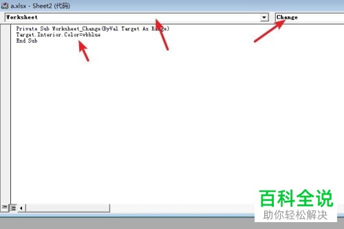 5. 雙擊打開代碼窗口后,在對象與進程中選擇“Worksheet_Change”,然后再輸入“Target.Interior.Color=vbblue”。