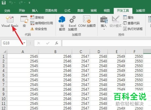 2. 點擊頁面上端的“開發工具”,在其下菜單欄中找到并點擊“Visual Basic”。