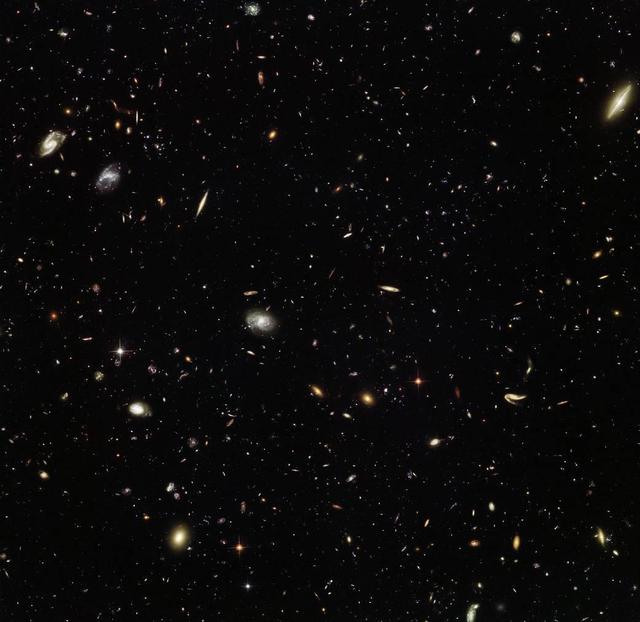 2003年,天文學家將地球天區分割成了1270萬塊,這樣一來只需要觀測其中一塊的星系數量,再把它乘以1270萬,理論上就能得到全宇宙的星系數量,因為我們的宇宙是各向同性的,也就是說從地球向任何方向觀測,在這張名為哈勃超級深空場的照片里,天文學家找到了1萬個星系,它們形態各異,在漆黑的宇宙背景上均勻點綴著,至于地球這樣的行星,也許比今天的地球人口總量還多。