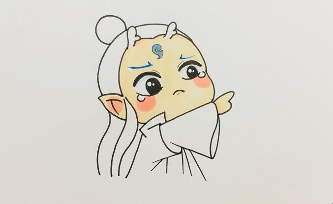 4、給畫好的敖丙上涂上顏色,給敖丙的臉涂上淡黃色,用稍微深一點(diǎn)的顏色,在臉上涂上陰影,接著用橙色在眼睛下面畫出紅暈,把額頭上的花鈿涂上藍(lán)色。