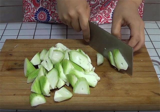 2.然后再把絲瓜去皮,去皮之后,再把絲瓜切滾刀塊。