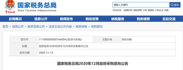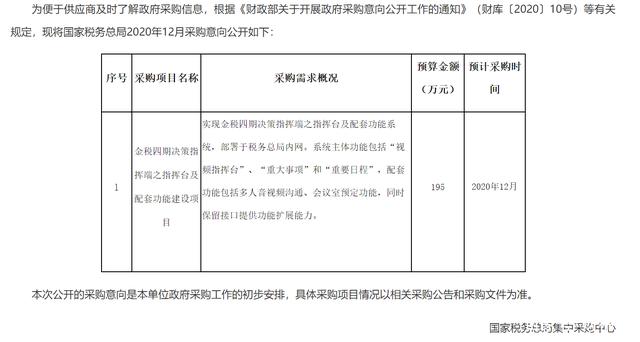 11月13日,國際稅務總局發布2020年12月政府采購意向公告中表示本次采購事項為金稅四期決策指揮端之指揮臺及配套功能建設項目。