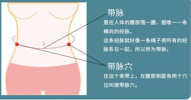 經云:「夫帶下俱是濕癥。而以帶名者,因帶脈不能約束,而有此病。」 帶脈,和肚臍平齊,像一條帶子纏在腰間,屬于奇經八脈之一,是人體唯一橫向的經脈,把全身縱向的經脈拴在一起,起總束諸脈的作用;