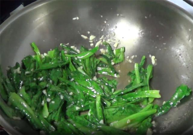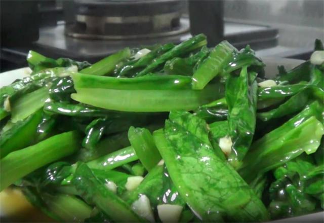 3.然后起鍋,加適量的油,油熱后下入蒜末,爆香后下入油麥菜,然后加適量素蠔油,炒勻后就可以出鍋了。