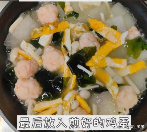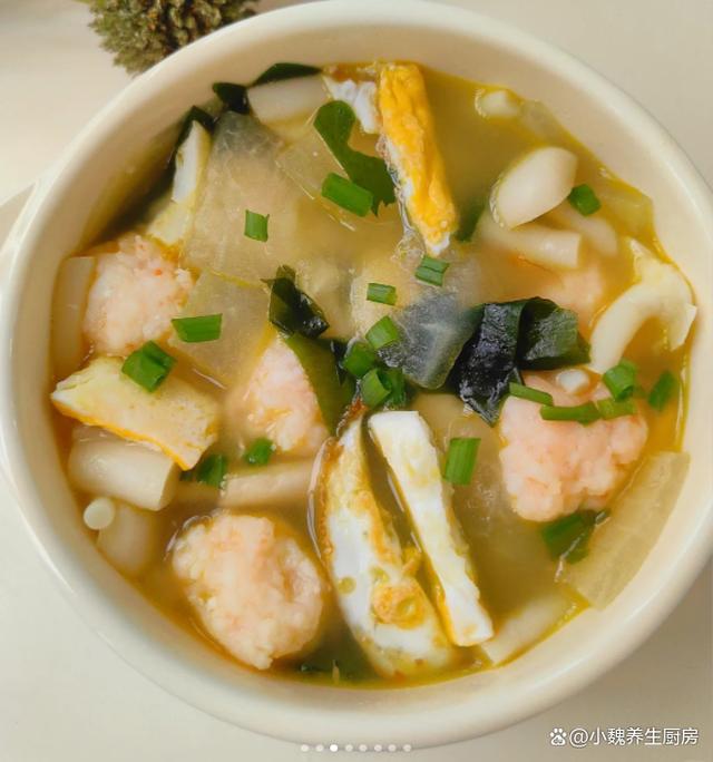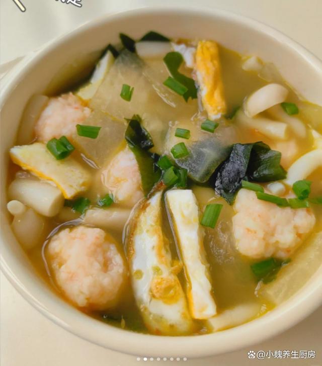 (www.ws46.com) 第七步:把蝦滑做成肉丸子,一次性下入到鍋中,全部都浮上來,下入一些裙帶菜,燜煮一小會兒。 第八步:放入雞蛋絲一起煮,調入味極鮮半勺,加上少許食鹽和胡椒粉調味,撒上蔥花即可,這款冬瓜海鮮菇裙帶菜蝦滑湯就制作完成了。 冬瓜海鮮菇裙帶菜蝦滑湯是一款特別鮮美的家常湯品,主要選用冬瓜,菌菇,蝦滑和裙帶菜制作而成,里面富含鈣質和蛋白質,湯品喝起來超級鮮美,孩子一定要多喝它,不懂吃可惜了。 網友們,你們是否掌握這款冬瓜海鮮菇裙帶菜蝦滑湯的做法嗎?(文中的配圖都出自網絡)