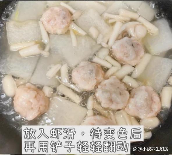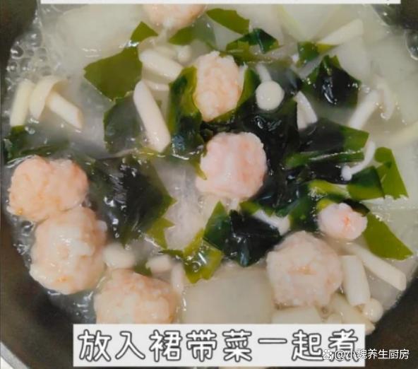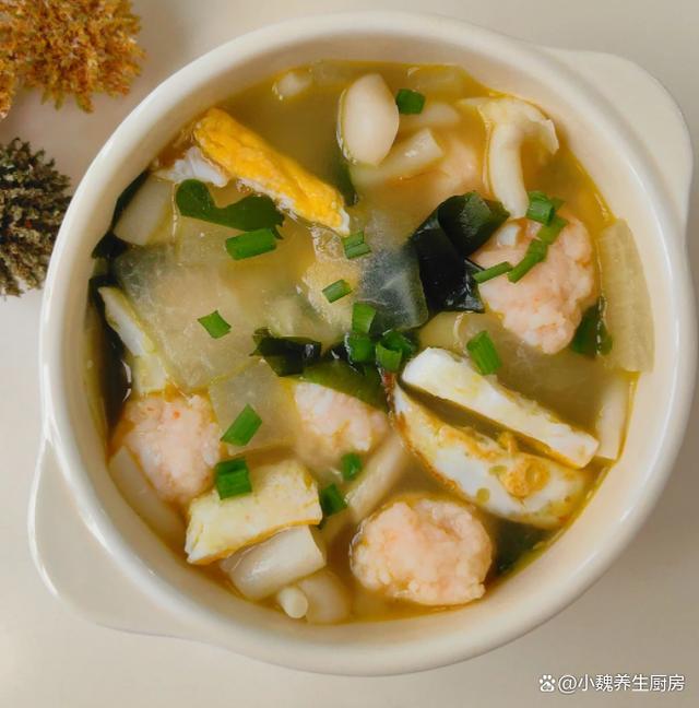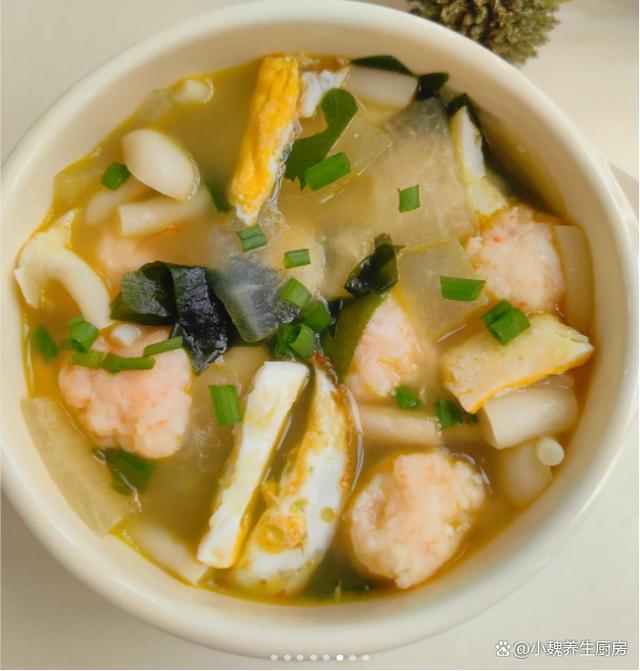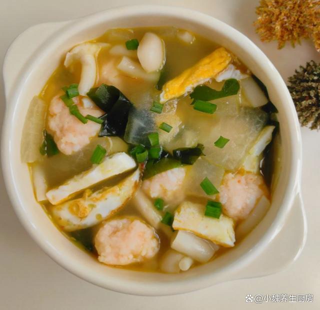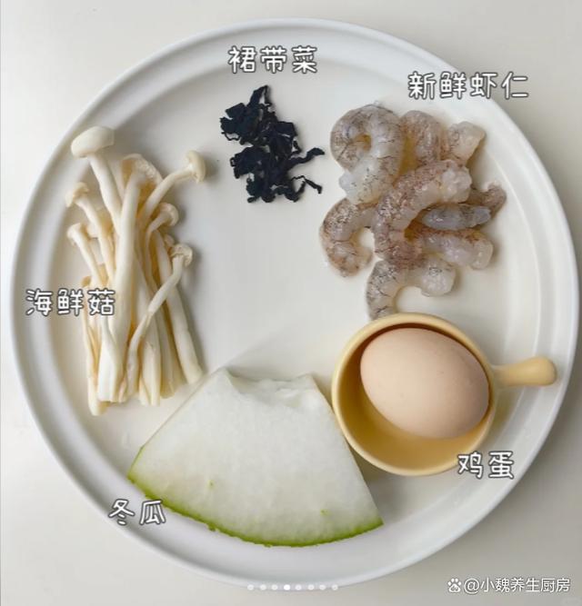 一晃眼到了深秋,九月份即將要結束了,天氣開始降溫了,天氣變冷后要增添衣服,避免出現著涼了,加強運動鍛煉,平常要適當溫補,多喝一些暖和和的湯品,有利于營養的消化,為冬天做好鋪墊。今天準備用冬瓜,海鮮菇和大蝦等食材,制作一款家常湯品——冬瓜海鮮菇裙帶菜蝦滑湯,湯品鮮美好喝,營養非常全面,老少皆宜,學會給家里孩子做一做吧。許多人肯定沒有喝過這款冬瓜海鮮菇裙帶菜蝦滑湯,到底應該如何制作呢?快一點跟著小編學起來。秋季一碗湯,一年不會慌!秋季要常喝這湯,補足營養,舒服過秋天。  【冬瓜海鮮菇裙帶菜蝦滑湯的烹飪步驟】 準備一些食材:選購200克老冬瓜(冬瓜是一種價格便宜的蔬菜,瓜肉潔白,吃起來特別清甜,搭配各種食材燉湯,湯品非常清淡,湯品鮮美),新鮮海鮮菇80克左右,裙帶菜少許,溫水和冷水少許,一個雞蛋,若干根香蔥,選購新鮮大蝦150克左右(建議要選擇鮮活的大蝦,個頭要選擇大一些,蝦肉會更加肥美,是做成蝦滑的首選),幾片生姜,香蔥若干根,食用油少許,半勺料酒,胡椒粉和食鹽若干,其他調味品。 詳細制作順序: 第一步:提前選購好冬瓜,大蝦,海鮮菇,雞蛋和裙帶菜等食材,先把海鮮菇的根部切掉,用清水沖洗干凈,控干水分備用。第二步:將老冬瓜削掉外皮,去掉瓜瓤洗干凈,切成厚一些的片狀,洗凈備用,生姜切成細絲或細末,香蔥也清洗干凈,切成若干小蔥花。