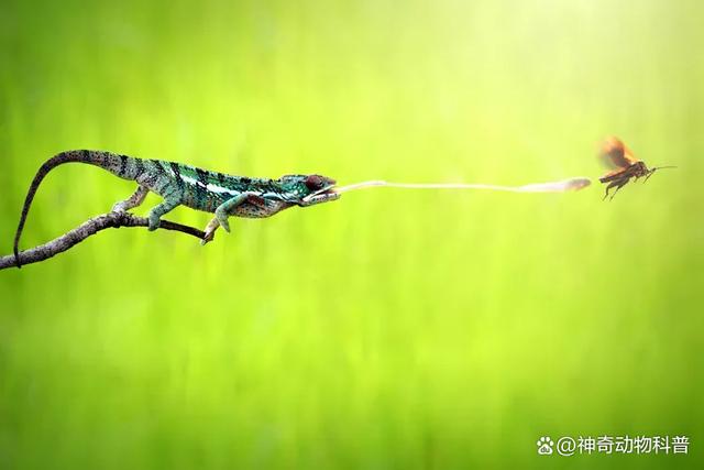 對于許多人來說,變色龍最令人不安的是它們的眼睛,它們在眼窩中獨立移動,從而提供近 360 度的視野。除了感知紫外線之外,它們還可以很好地判斷距離,因為每只眼睛都具有出色的深度感知能力。這使得蜥蜴能夠在不使用雙眼視覺的情況下,從 20 英尺外的地方瞄準美味的獵物昆蟲。變色龍的耳朵相對原始,只能聽到極其有限的頻率范圍內(nèi)的聲音,這在一定程度上平衡了其出色的視覺感。 08、又長又粘的舌頭