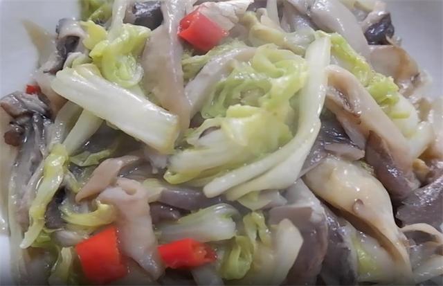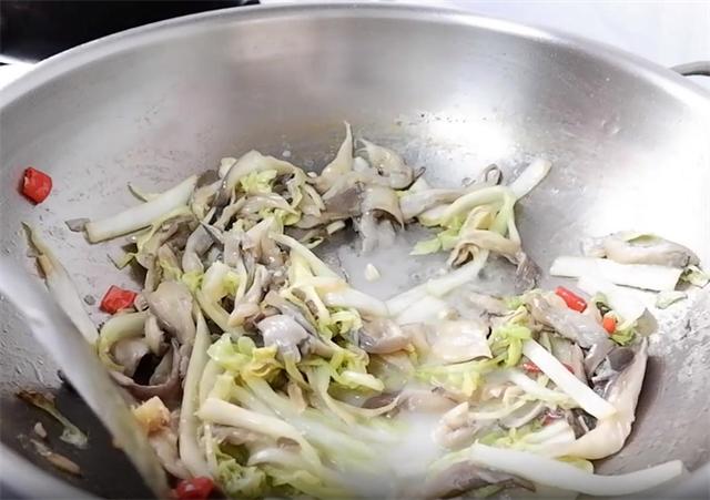 4.然后另起鍋,加少量的油,下蒜末、小米辣爆香,接著加入白菜,炒之前加入鹽和素蠔油,這樣可以更快的把白菜炒軟炒入味,白菜炒軟之后,下入平菇翻炒均勻,然后加少量的醬油調味,最后加少量的水淀粉翻炒均勻就可以出鍋了。