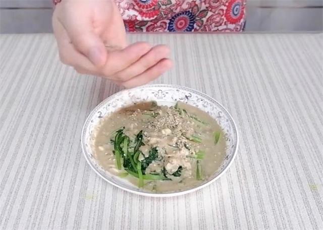 3.接著把調(diào)好的麻汁倒在茼蒿上,最后再撒適量的白芝麻。