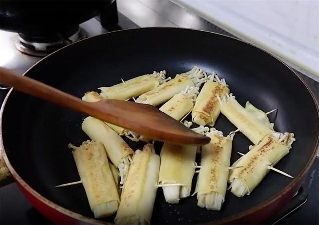 4.做這個要用平底鍋,加入少量的油就可以了,我們先把豆腐卷煎一下,煎的時候要用小火把金針菇的水分煎出來,再把干豆腐的兩面煎至金黃。