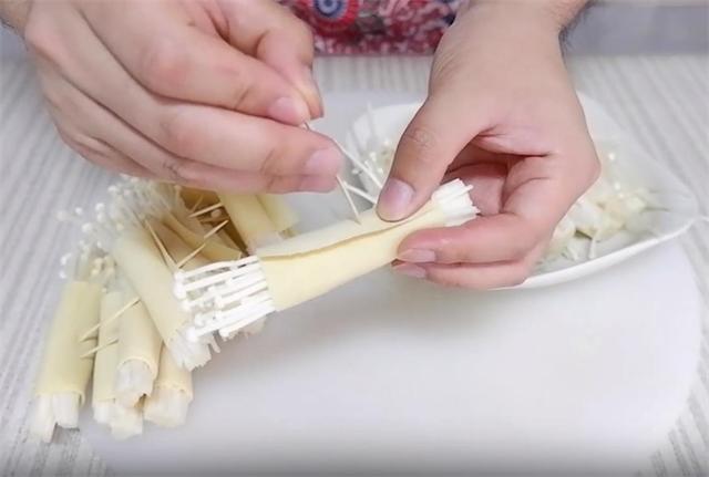 2.再取一些金針菇洗凈,用干豆腐把金針菇卷起來,再用牙簽固定一下。