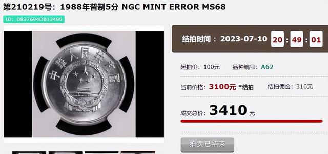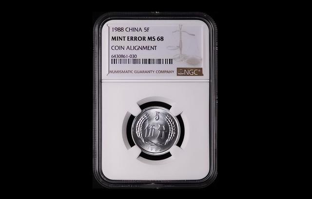 這種年份的5分一般是論斤成交的,一斤也就是70多,但是拍賣會中的那枚1988年的5分,它是一枚NGC68分的評級幣還有錯標,它的錯誤就是背逆,這種瑕疵光看一個幣面是看不出來的。