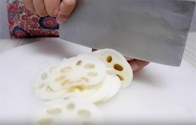1.朋友們,大家好,今天咱們做一道好吃的熗拌銀耳。先準備一小塊鮮藕,去皮洗凈,再用刀切薄片。