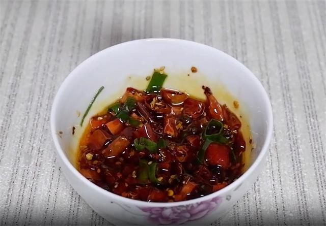 5.準備一個碗,加入蔥花、花椒粒,多一些干辣椒,然后加入半勺熱油,澆在碗中炸香,再加一勺糖,兩勺白醋,兩勺醬油,兩勺辣椒油,最后加少量的麻油,少量的芥末攪勻。