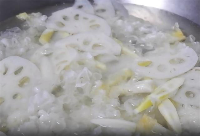 4.接著起鍋,水開之后下入銀耳,先煮兩分鐘,然后再加入藕和筍煮三分鐘,撈出備用。